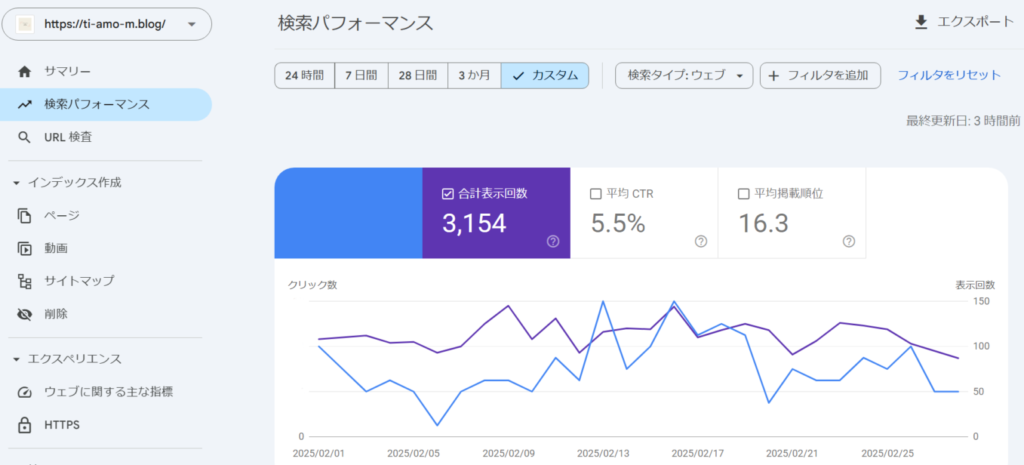 2025年2月のSearch Console(サーチコンソール)の合計表示回数3154と、
