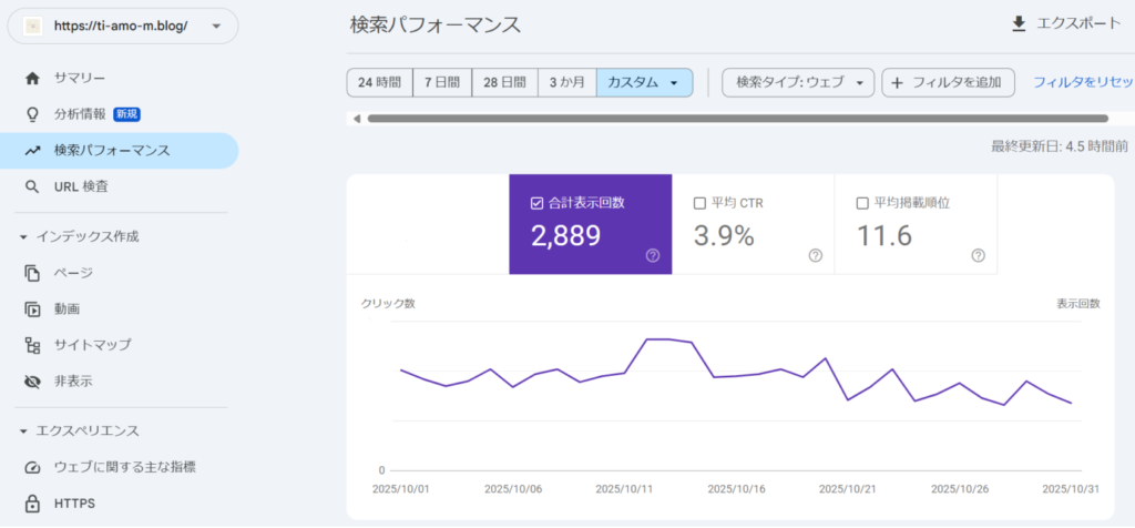 2025年10月のSearch Console(サーチコンソール)の合計表示回数は2889と、2025年11月(2000)と比べると、数としてはおよそ900ほど減少しています。